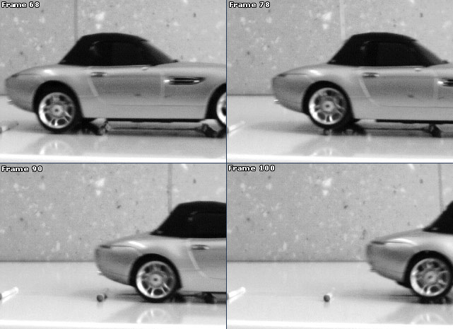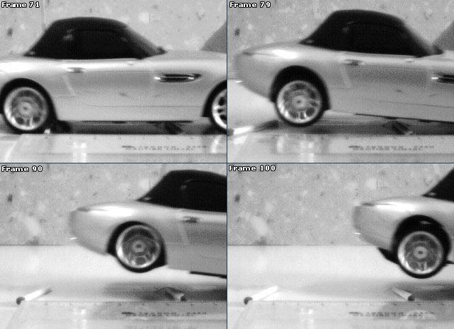 | This is so very cool. This should get a price or something. Some dudes at The Saven company have made some impressive movies. This is a film fotage done with a high speed camera. It's taken with a frame rate of 500 frames per second. This movie shows the performance of the original H-bar that the mini-Z comes with. The car is running over matches. Here you can download the movie High Speed test 1 (221 kb). - It's coded with DivX |